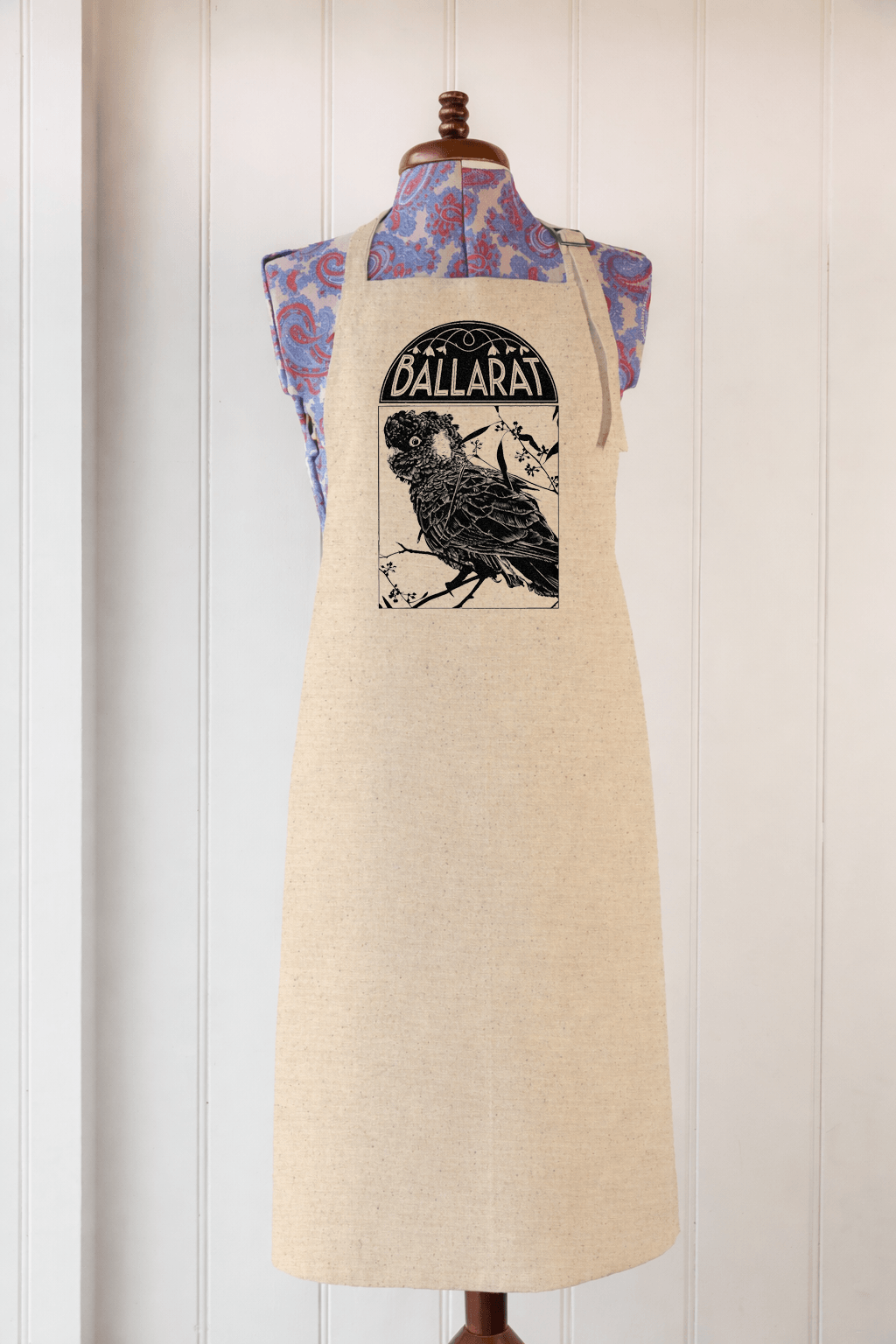 Durable, high-quality organic cotton aprons made from 100% organic oatmeal-coloured cotton. Featuring the a modified Ballarat black cockatoo design by Ballarat artist Jarrod Hall.