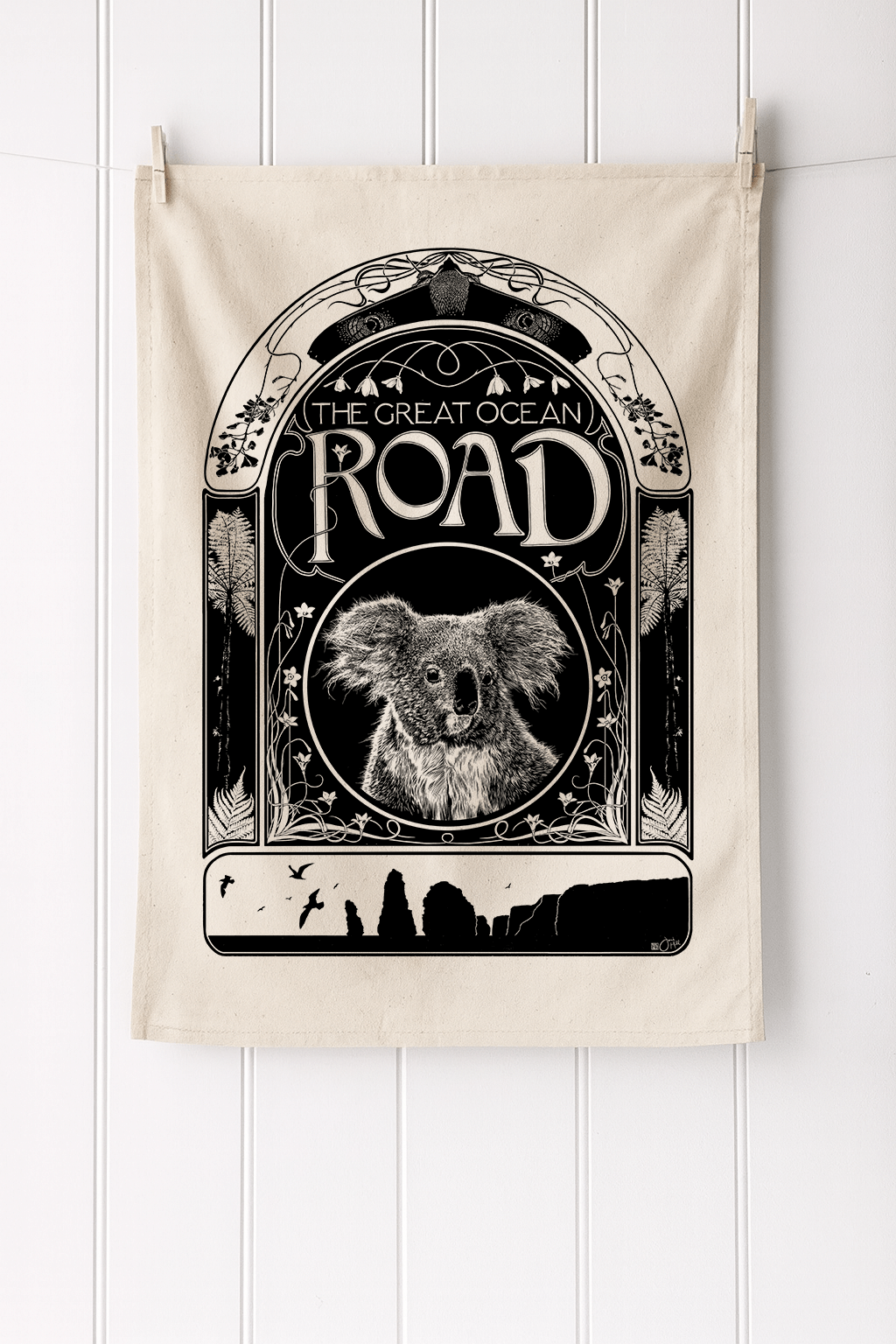Vintage Art Nouveau–inspired artwork celebrating The Great Ocean Road’s native wildlife and landscapes. Designed by local artist Jarrod Hall.